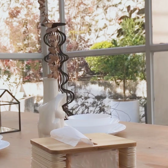 Our charming collapsible tissue box, expertly designed with a delightful combination of paper honeycomb and a bamboo board shell. This innovative piece not only adds a touch of elegance to your space but also adapts to your needs—automatically retracting as the number of tissues inside it fluctuates.